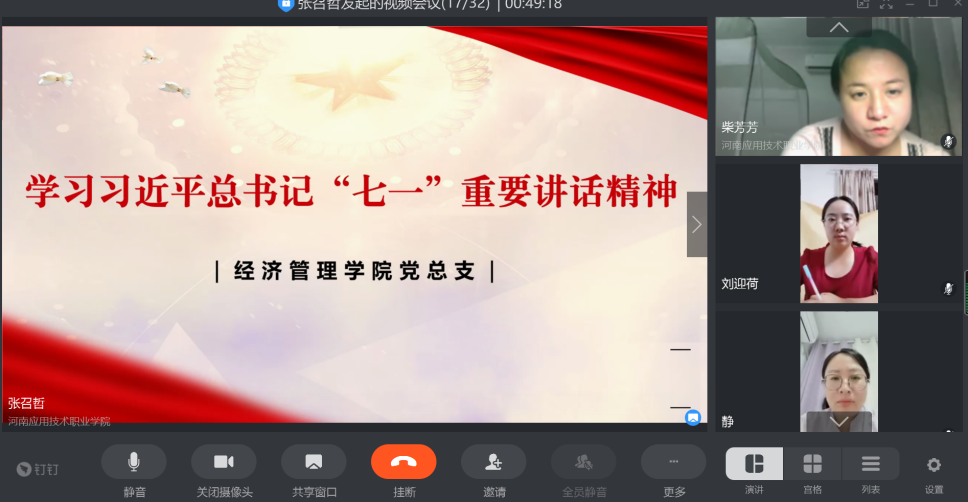 会议集体学习了习近平总书记在建党一百周年的重要讲话。2021年7月1日,习近平总书记出席庆祝中国共产党成立100周年大会并发表重要讲话。学习宣传贯彻习近平总书记“七一”重要讲话精神,是当前和今后一个时期各级党组织及党员的首要政治任务。建党百年,恰是风华正茂。习近平总书记在庆祝中国共产党成立100周年大会上的讲话,通篇闪耀着马克思主义的真理光辉和时代光芒,高瞻远瞩,以史为鉴,开创未来。此次讲话庄严宣告了第一个百年奋斗目标的实现,高度概括了中国共产党百年奋斗的主题,深刻提出和阐释了伟大建党精神,全面总结了百年奋斗的九条经验启示,郑重向全体党员发出了明确号召。围绕学习贯彻习近平总书记“七一”重要讲话精神,全体党员教师紧密结合思想和工作实际进行了交流发言。大家表示在一百年的非凡奋斗历程中,一代又一代中国共产党人顽强拼搏、不懈奋斗,涌现了一大批视死如归的革命烈士、一大批顽强奋斗的英雄人物、一大批忘我奉献的先进模范,给我们留下了宝贵的精神财富。作为新时代的教育工作者,我们有着新的使命、新的奋斗、新的未来,唯有激荡奋斗热血、牢记宗旨理念、保持拼搏姿态、树牢道德风范,方能在这份历经百年的时代“答卷”里添上浓墨重彩的一笔。