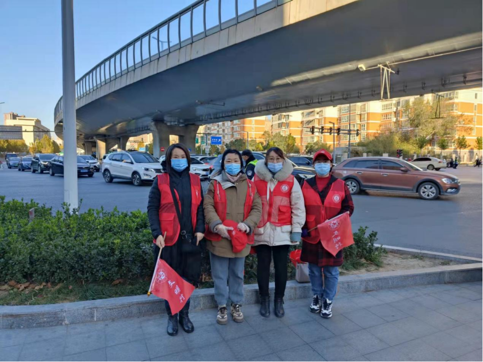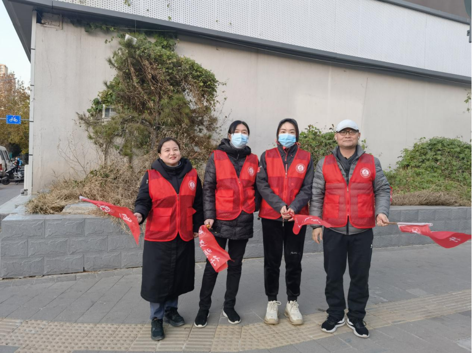 为了给市民出行营造畅通、文明的交通环境,2021年11月30日,beat365英国官网网站范红梅、关杰、柴芳芳、何晓升、朱冠颖、赵静、刘蕊、刘迎荷八位老师组成两支志愿者队伍,走上街头向群众宣传文明出行理念,引导市民文明出行。志愿者们到达农业路桐柏路路口后,分成四个小组,分散在每个路口,手持交通引导旗,对行人和非机动车遵守交通规则进行引导。