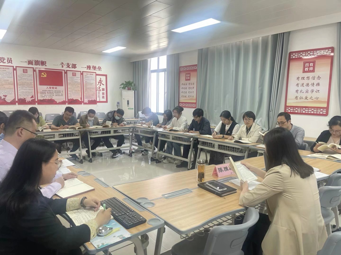 随后,陈雅莉就《全面从严治党是一场自我革命》一文展开深入领学。她先是从坚持思想建党和制度治党相统一、坚持使命引领和问题导向相统一、坚持抓“关键少数”和管“绝大多数”相统一、坚持行使权力和担当责任相统一、坚持严格管理和关心信任相统一、坚持党内监督和群众监督相统一等六个方面,带领大家逐字逐句读、原原本本学,落实“读原著”要求。接下来,陈雅莉围绕上述六个方面,深入分析了其蕴含的柔性和刚性、被动和主动、“两点”与“重点”、权利和义务、监督与信任、内部和外部几组逻辑关系,对党员们接下来的“悟原理”给予了引导和启发。之后,陈雅莉结合纪委的日常工作和年度重点工作,对上述六点再次深入分析、深研细剖,以由理论到实践、由一般到特殊、由抽象到具体的方法与手段,达到了“联系实际学”的良好效果。