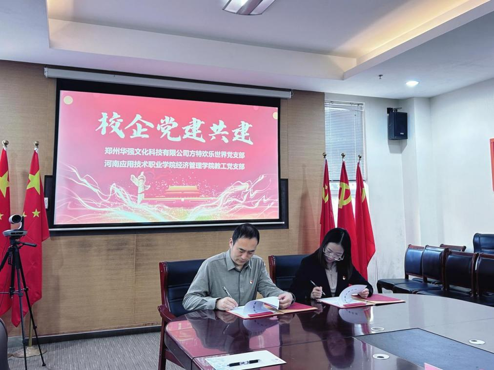 在全体参会人员见证下,beat365英国官网网站教工党支部书记张召哲与郑州华强方特人资总监姚真真,共同签署党建共建协议,明确共建目标、内容及实施步骤。双方均强调,新时代加强校企党建合作极具战略意义,既能提升党组织建设水平,又能转化党建优势,为培育高素质技术技能人才、服务地方经济发展添砖加瓦。
