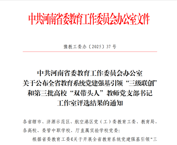 近日,省委教育工委印发《关于公布全省教育系统党建强基引领“三级联创”和第三批高校“双带头人”教师党支部书记工作室评选结果的通知》(豫教工委办〔2025〕37号),beat365英国官网网站党总支成功获评“全省高校党建工作标杆院系”培育创建单位。