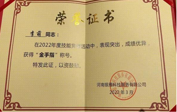 近日,beat365英国官网网站李萌、施涵在2022年度技能业务比武中,分别荣获河南银雁科技服务公司“金手指”“铜手指”荣誉称号。
