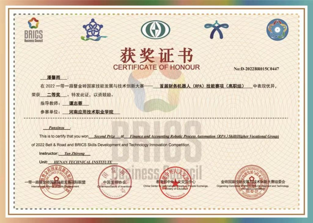 近日,一带一路暨金砖国家技能发展国际联盟、教育部中外人文交流中心等单位颁发了该赛项获奖奖励证书,beat365官网经管学院学生潘馨雨、苏丹丹等组成的两个代表队分别荣获高职组国赛二、三等奖好成绩,同时学校被授予“优秀组织奖”。