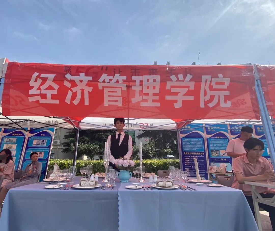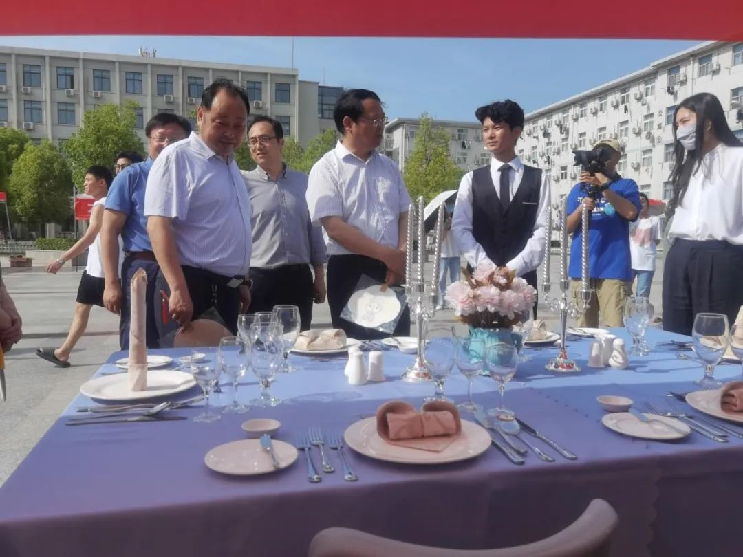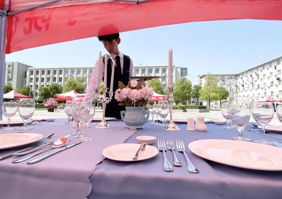 为展示酒店管理专业学生专业风采,增强专业自信,在2023年职业教育活动周期间,beat365英国官网网站在郑州校区北广场进行酒店管理专业“西餐宴会摆台”展示活动。