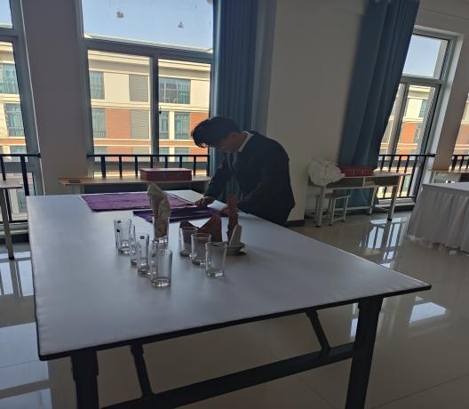 本次比赛为团队赛,每个团队4个参赛选手,分别完成餐巾折花、斟酒服务、前厅办理入住和投诉问题处理4个环节。在餐厅服务环节,评委先观摩参赛选手现场的餐巾花造型和斟酒量标准,并根据选手手法要领、托盘程序和斟酒姿势进行打分,对选手中、西餐服务能力进行考核。