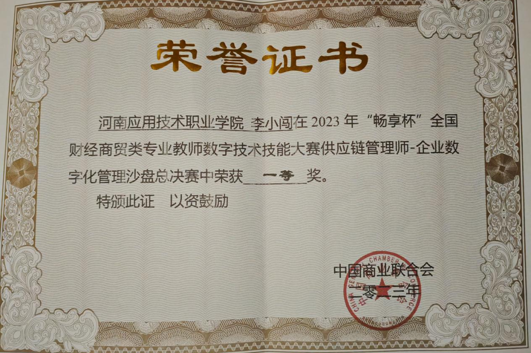 beat365英国官网网站李小闯老师代表beat365官网参加了企业数字化管理沙盘赛项并同时参与了竞赛附加项目“学习标兵”评选活动。李老师认真练习,在11月26日的网络初赛选拔中以小组第一的成绩跻身全国总决赛并荣获第二批“畅享杯”全国财经商贸类专业教师数字技术技能大赛“学习标兵”称号。