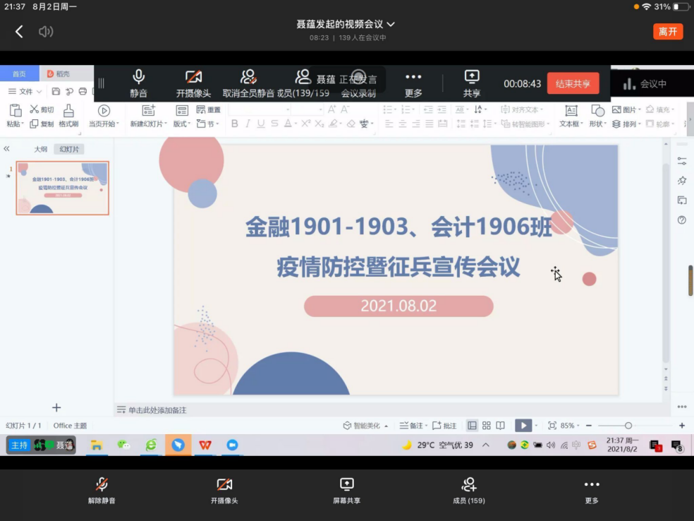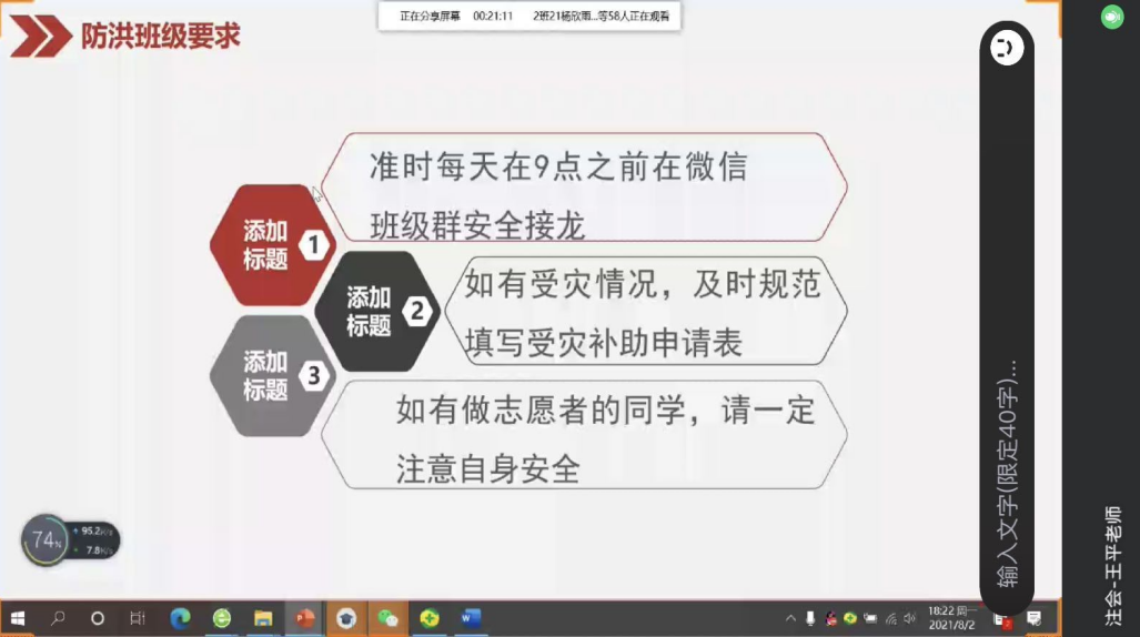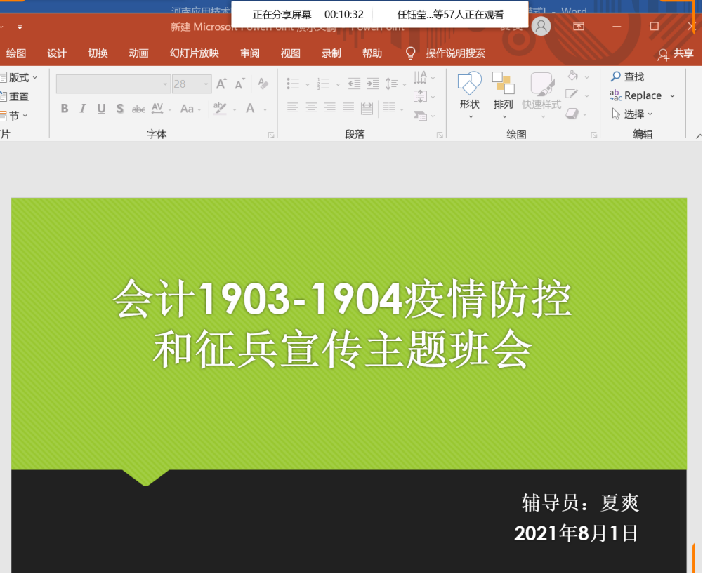 基于当前新冠肺炎疫情形势变化复杂,为进一步落实学校疫情防控工作要求,持续加强大学生思想政治教育,帮助同学们顺利度过一个充实、愉快、安全的假期,beat365英国官网网站19级、20级全体班主任、辅导员于8月1日、2日两天,组织各班召开了线上疫情防控暨征兵宣传主题班会。