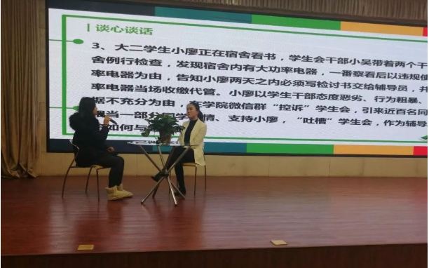 接着进行“案例分析”环节,各位选手通过具体案例展示在遇到学生与老师或学校产生矛盾时处理问题的方式。8号马丽老师在针对领导莅临学校检查时要求学生高标准打扫宿舍遭到学生质问的行为进行分析,并向这位同学进行思想教育,让这位同学认识到自己做法的不妥之处。最后进行理论宣讲,各位辅导员系统的为大家讲述理论概念,展示出自己丰富的理论知识储备。