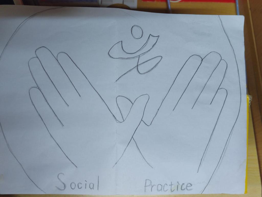 设计理念:首先映入眼帘的是一双手,意味着社会实践的前提是要用一双手支撑,一步步发展其次就是手上面类似于一个小人的图片,代表着青少年,表面我们的青春活力,积极向善上的心态。