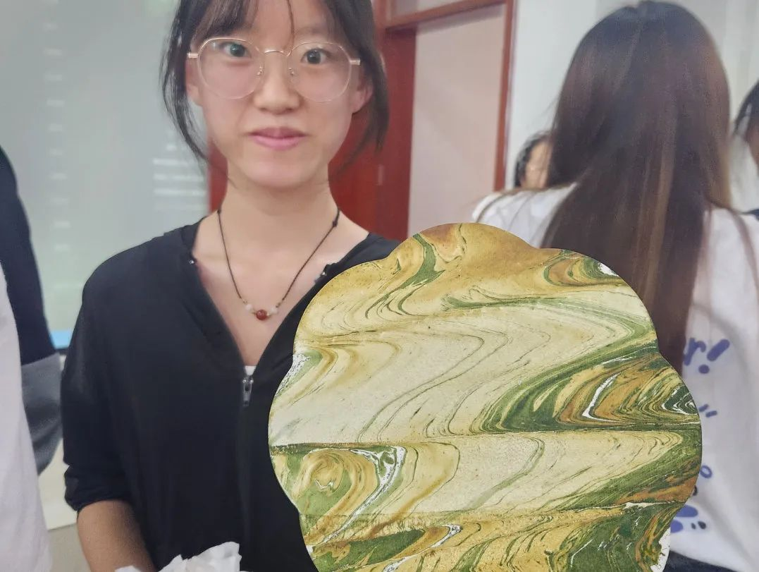 随后,同学们分组进行了漆扇制作实践。他们亲自挑选扇型,滴漆入水,以漆为笔在水中作画,最后出水成扇。每一个步骤都精心操作,感受每一个环节的挑战和乐趣,“独一无二”的漆扇在大家手中逐渐成型,制作过程大家紧密合作,增进了团队的凝聚力。大家不仅学会了漂漆扇的制作技巧,更是在这个过程中发现了自我,释放了内心的创造力,实现了心灵上的疗愈。