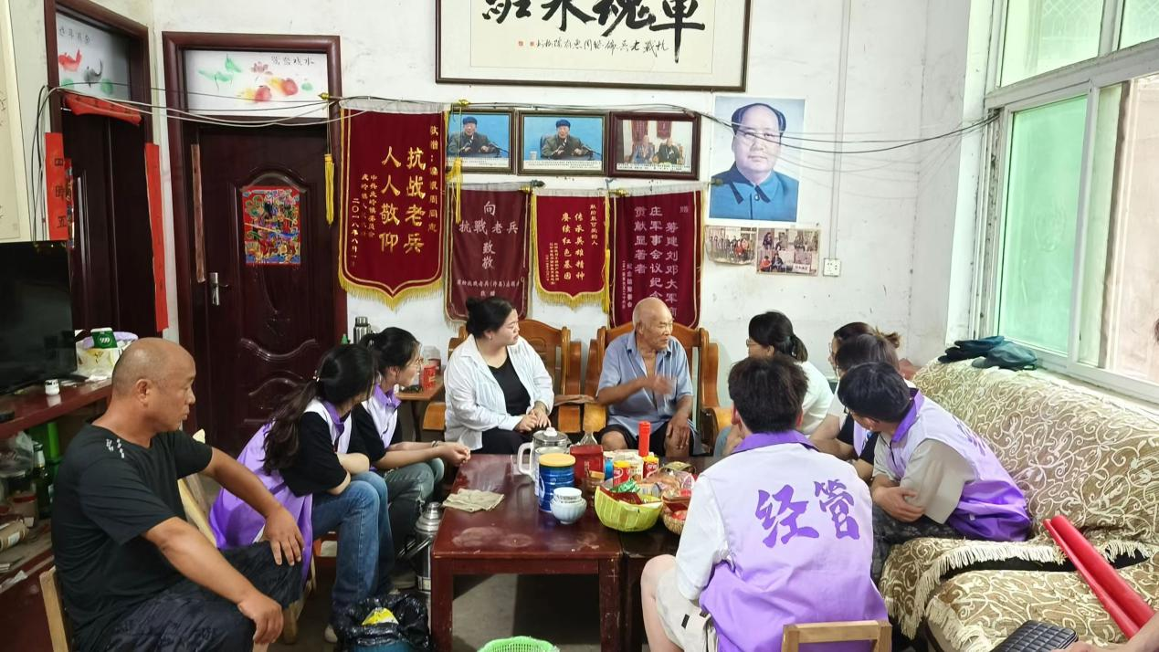 在许昌市襄城县岗西前街社区,社区书记对大家的到来表示热烈欢迎并召开交流座谈会。随后,在社区书记带领下,大家一起看望抗战老兵偏银周。在偏爷爷家中,满墙的锦旗和琳琅满目的奖状,瞬间震撼了在场的每一个人。在交谈中,大家了解到,偏爷爷在13岁时便踏上了革命征程,即使身受多处重伤,依旧凭借坚定信念与顽强毅力,为革命事业贡献青春力量。在聆听先辈波澜壮阔的抗战历史中,大家进一步坚定理想信念,传承红色基因,汲取奋进力量。