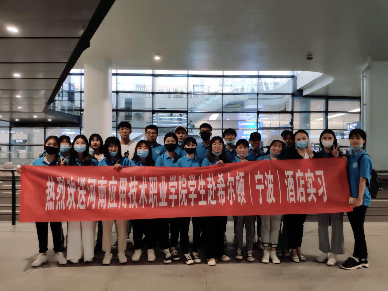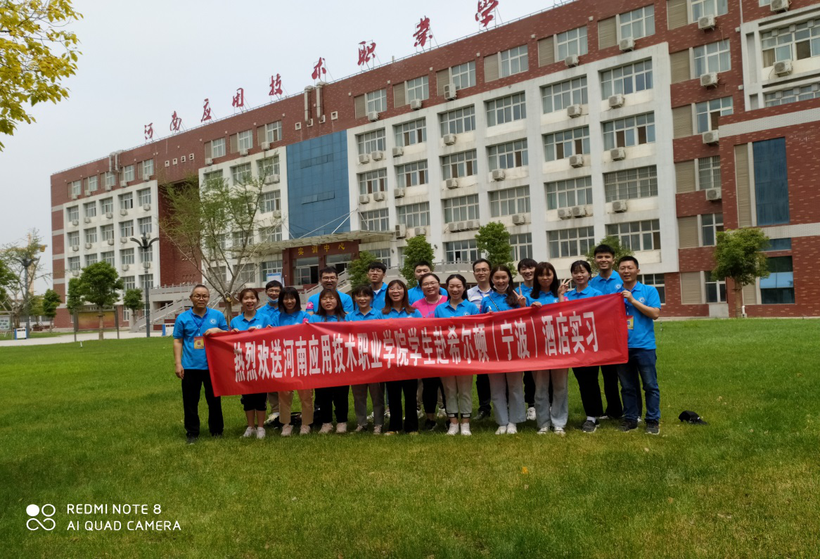 2020年6月5日,河南应用技术职业学beat365英国官网网站20名学生及2名带队教师,身着统一工装,在学校实训大楼前开心合影。随后统一乘车前往新郑机场,搭乘由希尔顿集团统一安排的航班前往其宁波酒店顶岗实习。