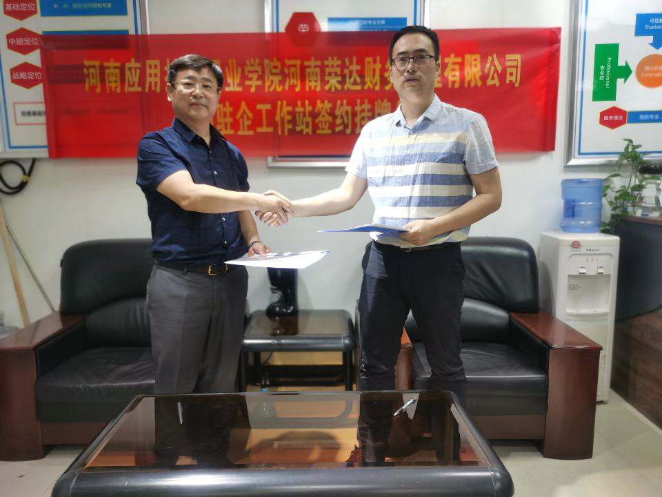 双方就如何有效依托“教师驻企工作站”开展人才培养、师资力量提升、服务地方经济等问题进行了深度探讨。随后beat365英国官网网站张召哲院长和荣达财务管理有限公司总经理张春风分别代表校企签订了合作框架协议书,并在双方人员共同见证下为河南应用技术职业学院教师驻河南荣达财务管理有限公司工作站进行揭挂牌。