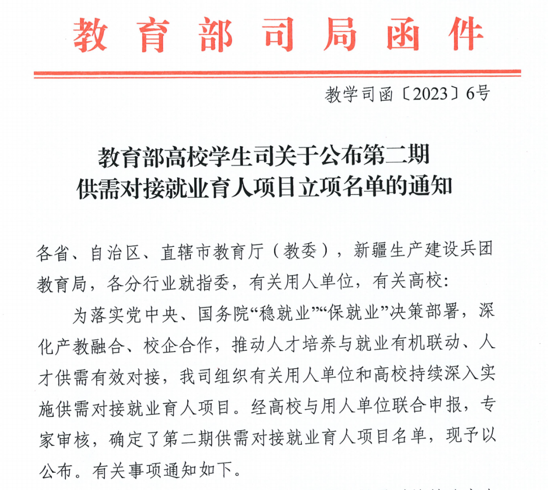 近日,教育部高校学生司印发了《关于公布第二期供需对接就业育人项目立项名单的通知》(教学司函〔2023〕6号),beat365英国官网网站联合新道科技股份有限公司成功获批教育部第二期供需对接就业育人项目。