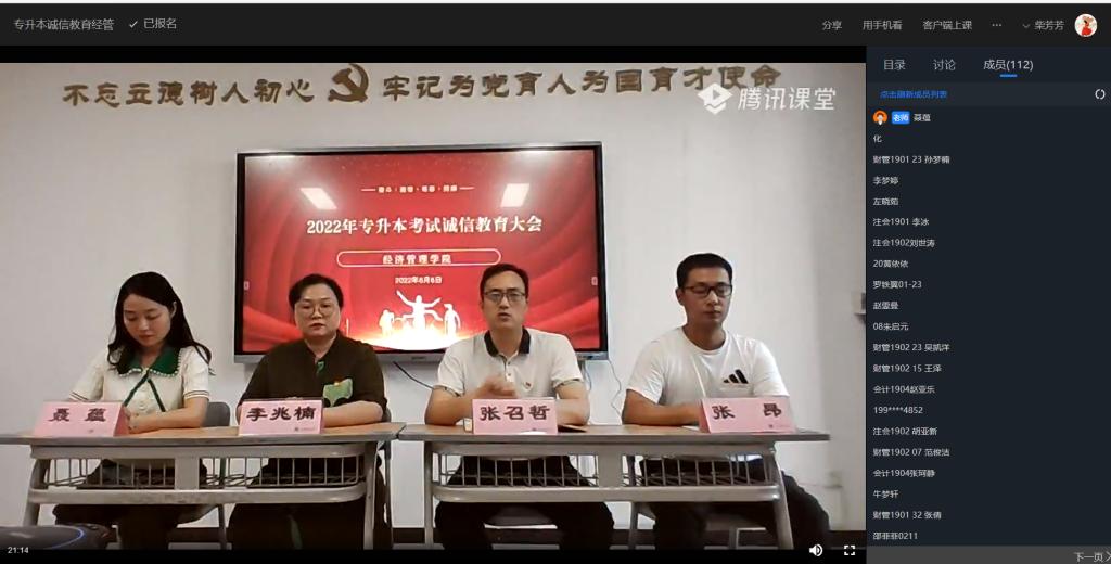 为提高2022年专升本考生诚信意识,培养考生诚信品质,营造诚信、自律、自强校园文化氛围。2022年6月6日下午,通过腾讯课堂,beat365英国官网网站召开2022年专升本考试诚信教育大会。会议由团总支书记聂蕴主持,165名专升本考生参加会议,院长张召哲、书记李兆楠、学工办主任张昂出席会议。