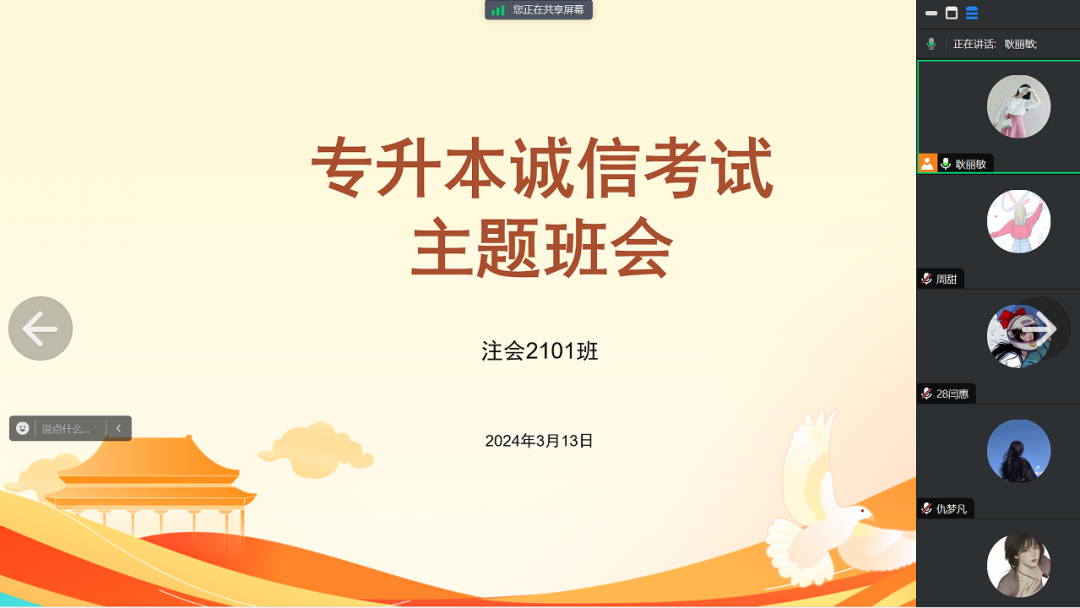 会上,辅导员老师们首先带领学生观看了《刑法修正案(九)》警示教育片和国家诚信考试宣传动画,之后认真学习《国家教育考试违规处理办法》,了解认识到在国家考试中作弊的严重后果。通过诚信考试教育,使学生充分认识到重视诚信考试,是责任感的体现;诚信应考,则是道德品格的体现。老师们认真叮嘱同学们要以诚信的态度对待本次专升本考试,考出真实水平。辅导员老师们和同学们一起为诚信考试进行宣誓,并在《河南省2024年普通高校专升本招生考试承诺书上》上签字。最后辅导员老师为学生详细讲解专升本考试无声入场的详细要求和重要事项,并认真回答学生的疑问。同时,向学生介绍考前高效复习和心态维稳小技巧,引导学生正确认识考前压力,合理分配学习和休息时间,保持良好风貌,从容应对考试,获取好成绩。