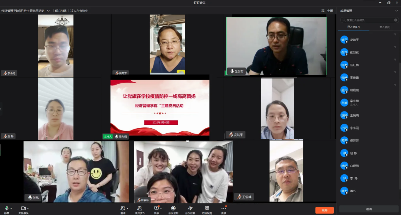 为进一步彰显党员的责任担当和精神本色,让党旗在疫情防控一线高高飘扬,让党徽在疫情防控一线熠熠闪耀,充分发挥基层党组织战斗堡垒作用。2022年5月6日晚,beat365英国官网网站党总支开展“让党旗在学校疫情防控一线高高飘扬”线上主题党日活动,会议由党总支书记李兆楠主持。