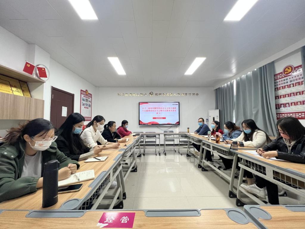 会上,全体党员教师集中学习《求是》杂志2022年第20期习近平总书记文章《坚持人民至上》,共同学习《习近平谈治国理政》(第四卷)专题八“坚定不移走高质量发展之路”、《习近平生态文明思想学习纲要》专题四“绿色发展是发展观的深刻革命--关于生态文明建设的战略路径”、《习近平经济思想学习纲要》专题六“推动高质量发展--关于我国经济发展的鲜明主题”以及《全面从严治党向基层延伸》专题一“推动全面从严治党向基层延伸”。