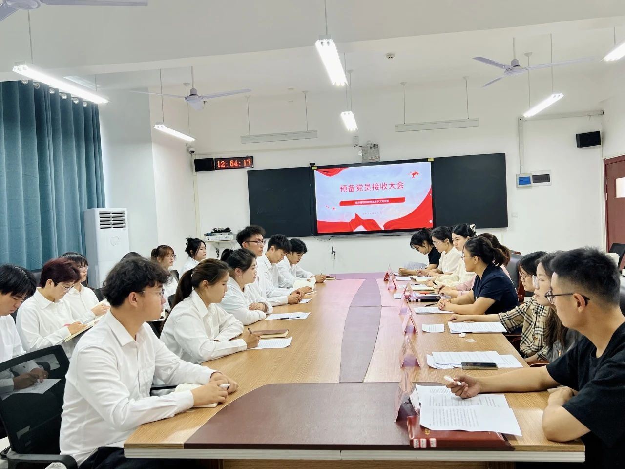 会上,郜心甜等13名发展对象依次汇报考察期个人思想政治表现,表达向党组织积极靠拢的决心、愿望。入党介绍人汇报发展对象考察期间基本情况,就其能否入党表明意见。随后,全体党员采取无记名投票方式进行表决。经表决,一致同意接收郜心甜等13名同志为中共预备党员。发展对象代表段建豪向支部大会表决心,表示在今后学习生活中,要时刻以合格党员标准严格要求自己。